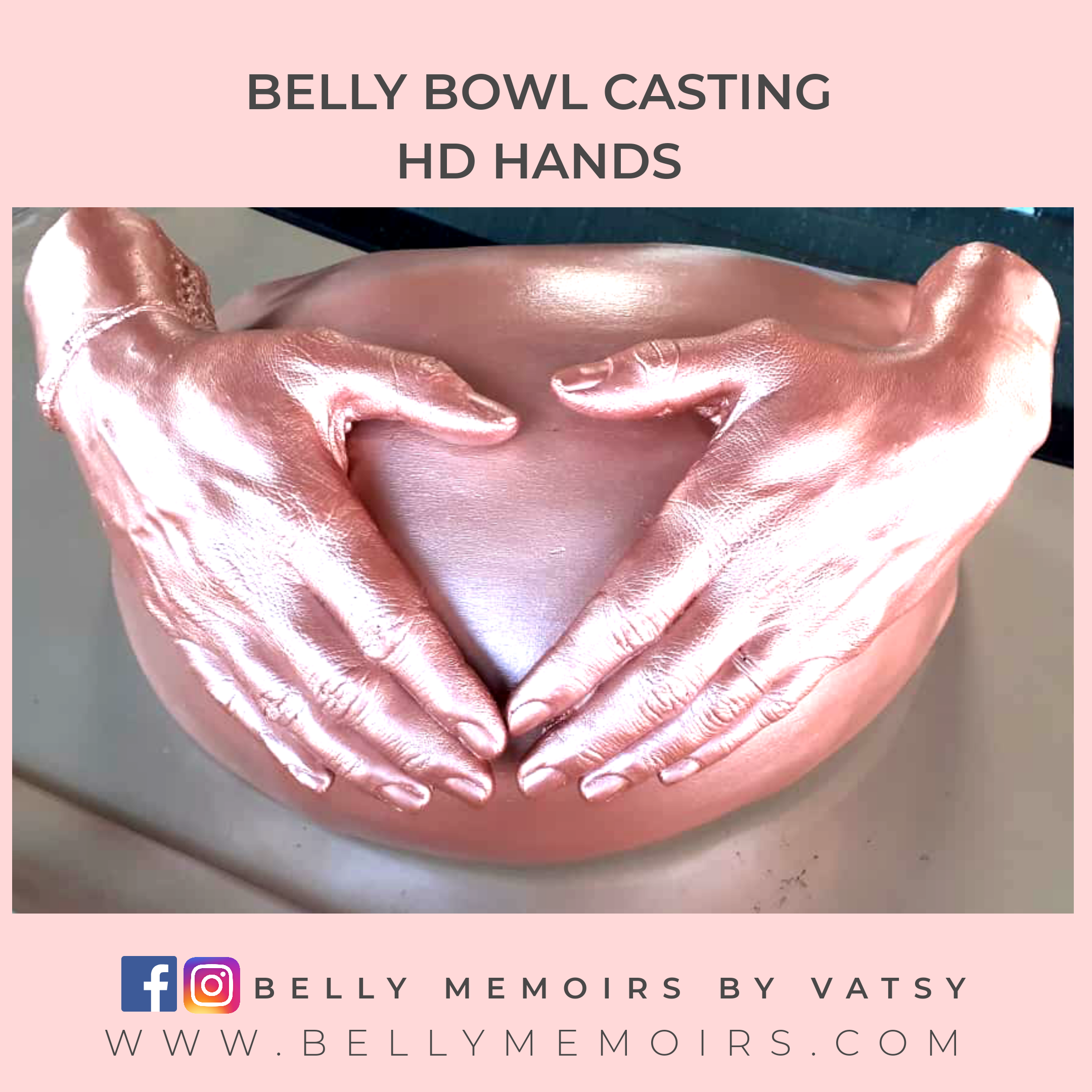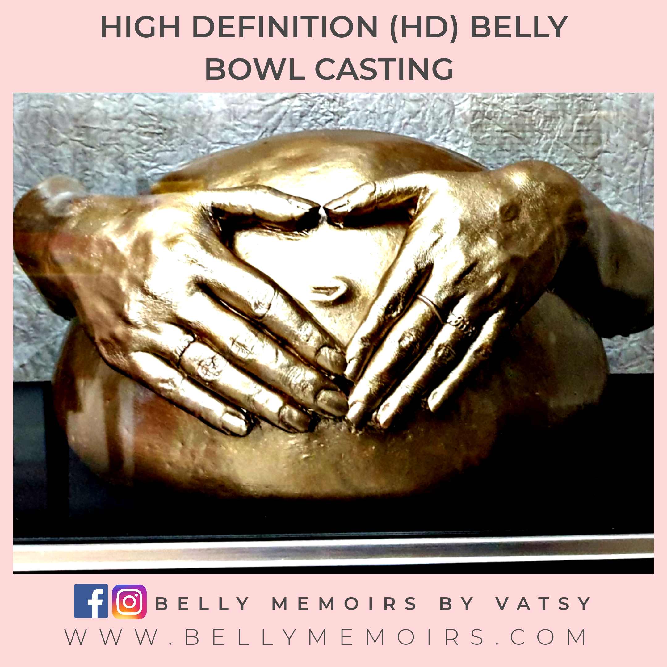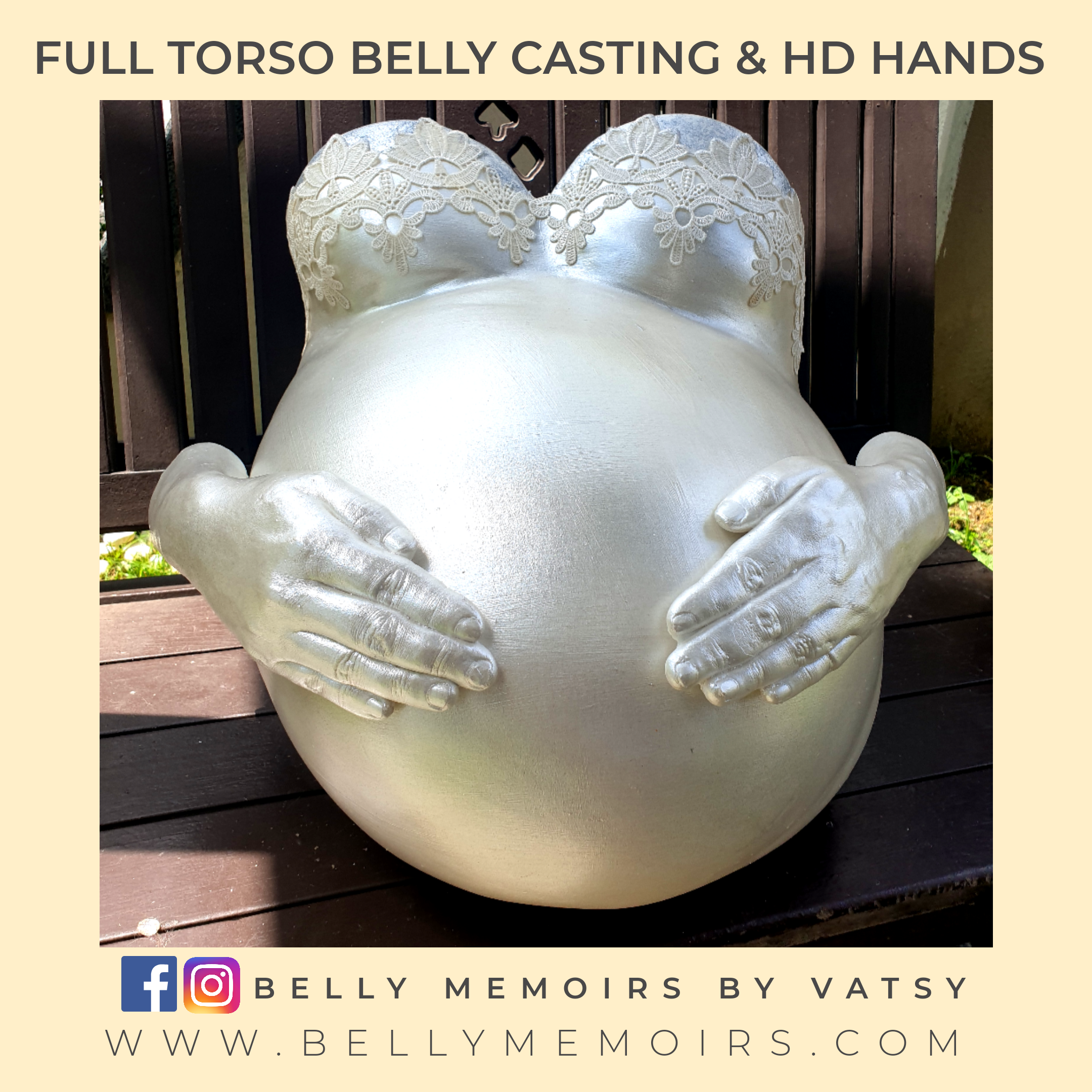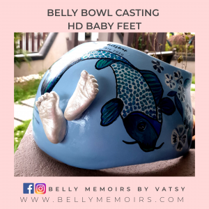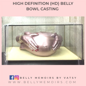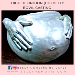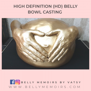 This captures only the belly as part of the casting that looks like a bowl. It can be left plain or customised with adding on the parents hands, newborn’s feet cast, painting or just about anything you want. Can be done up to 39 weeks of pregnancy.