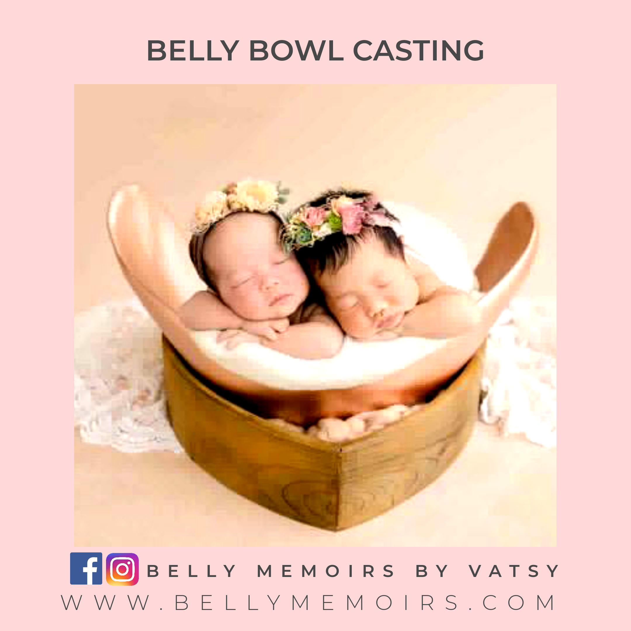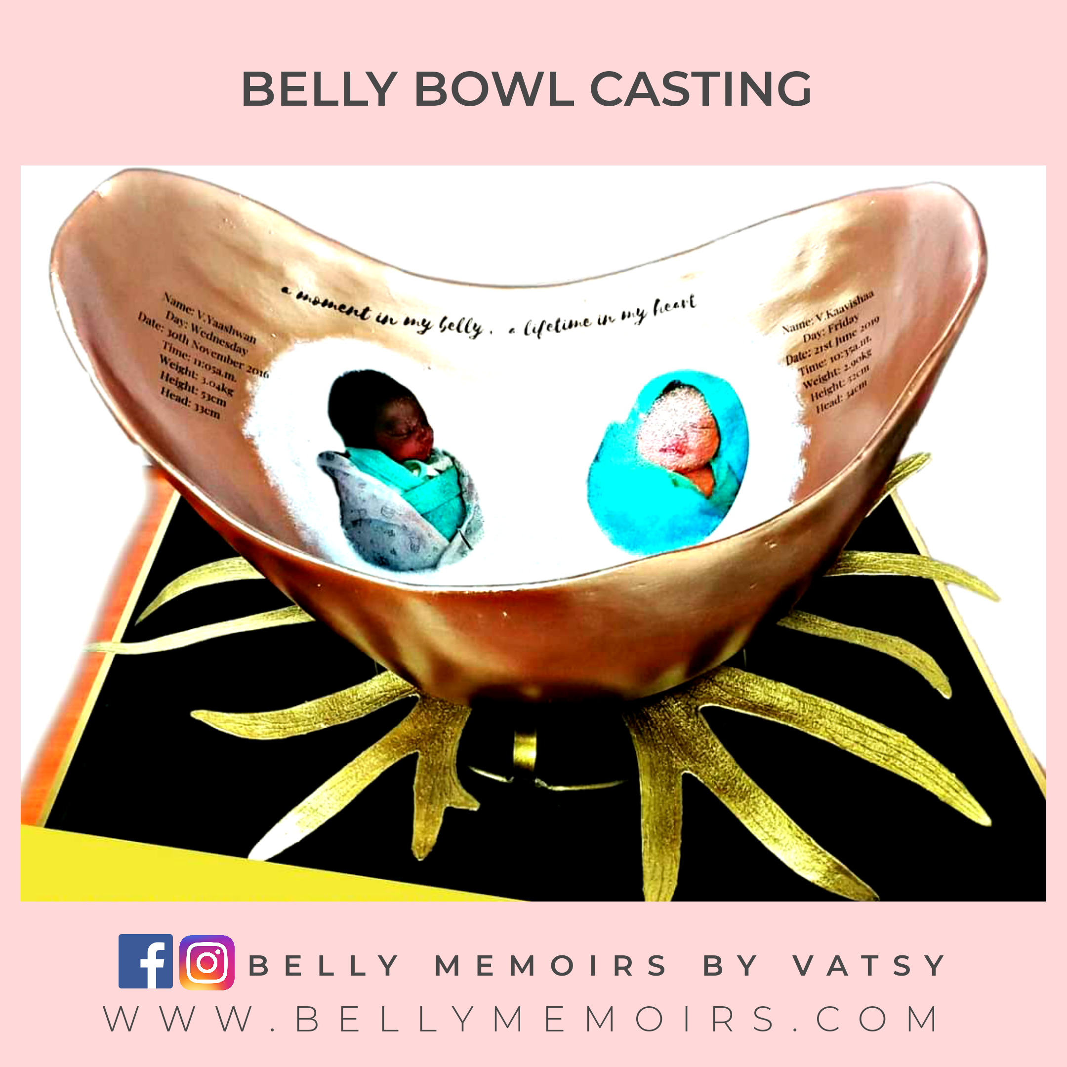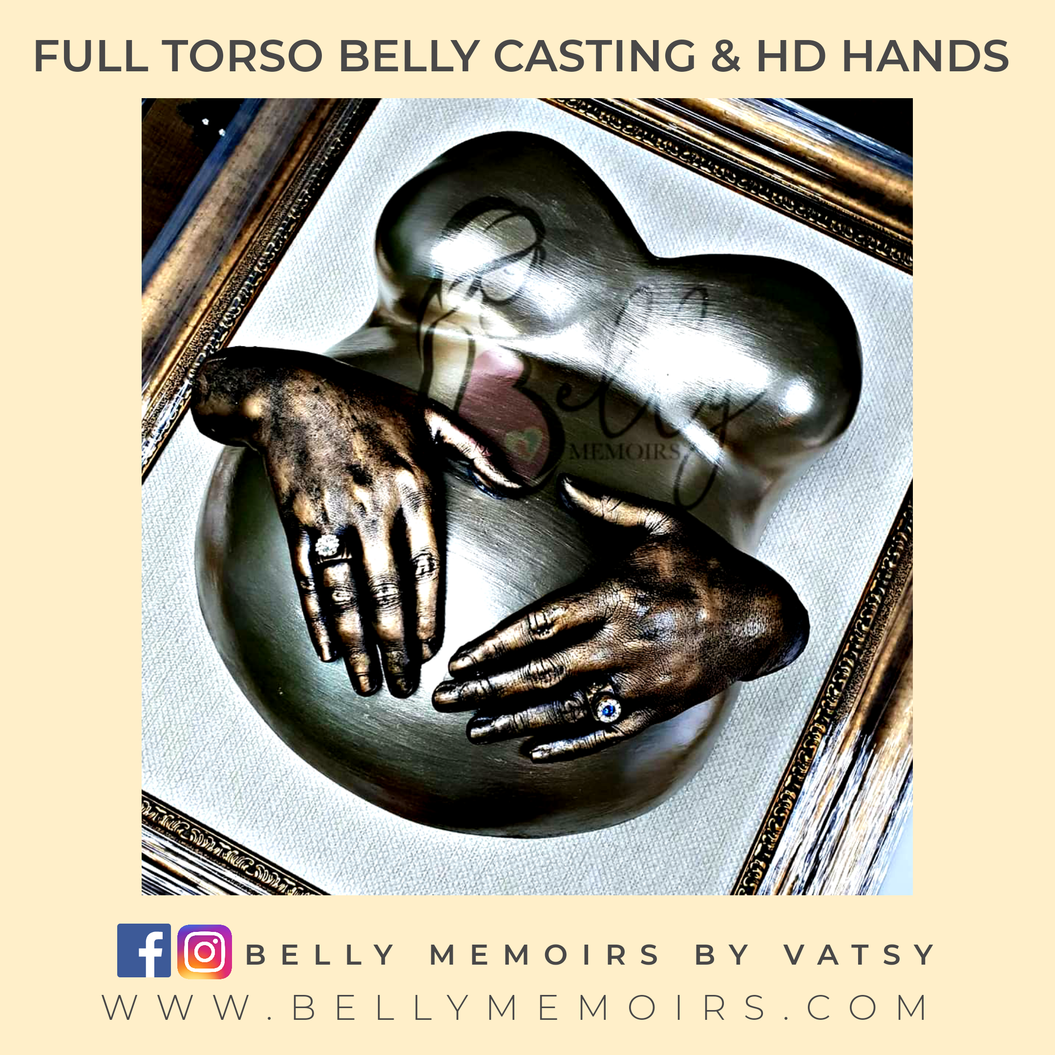 This captures only the belly as part of the casting that looks like a bowl. It can be left plain or customised with adding on the parents hands, newborn’s feet cast, painting or just about anything you want. Can be done up to 39 weeks of pregnancy.