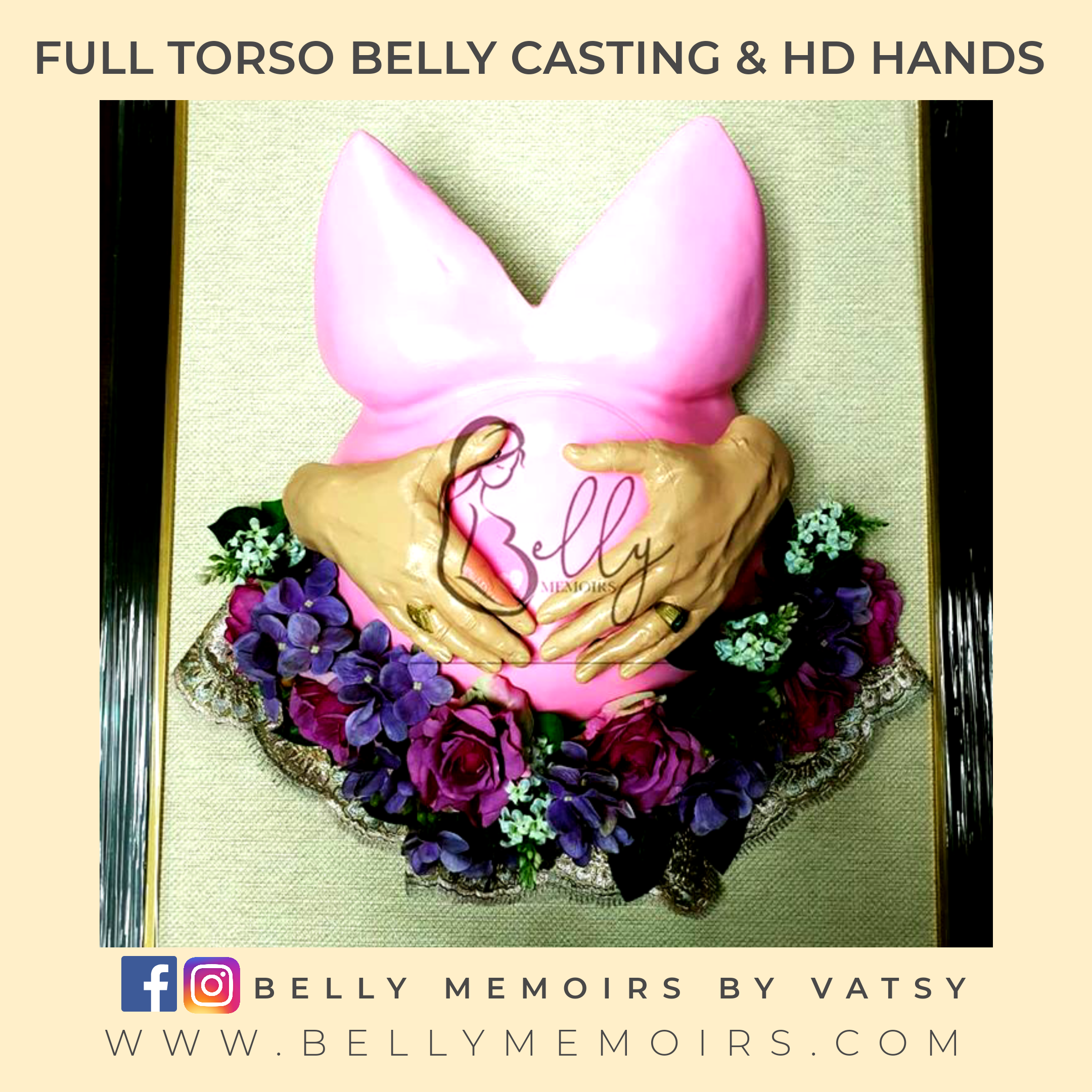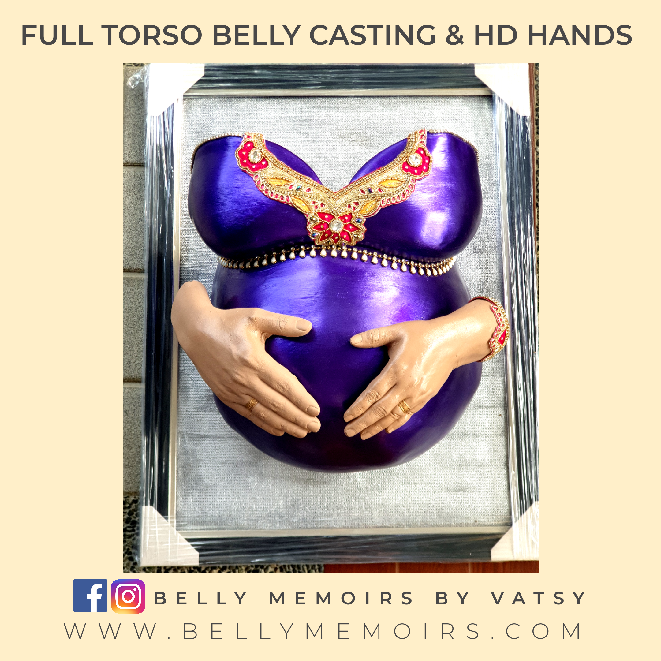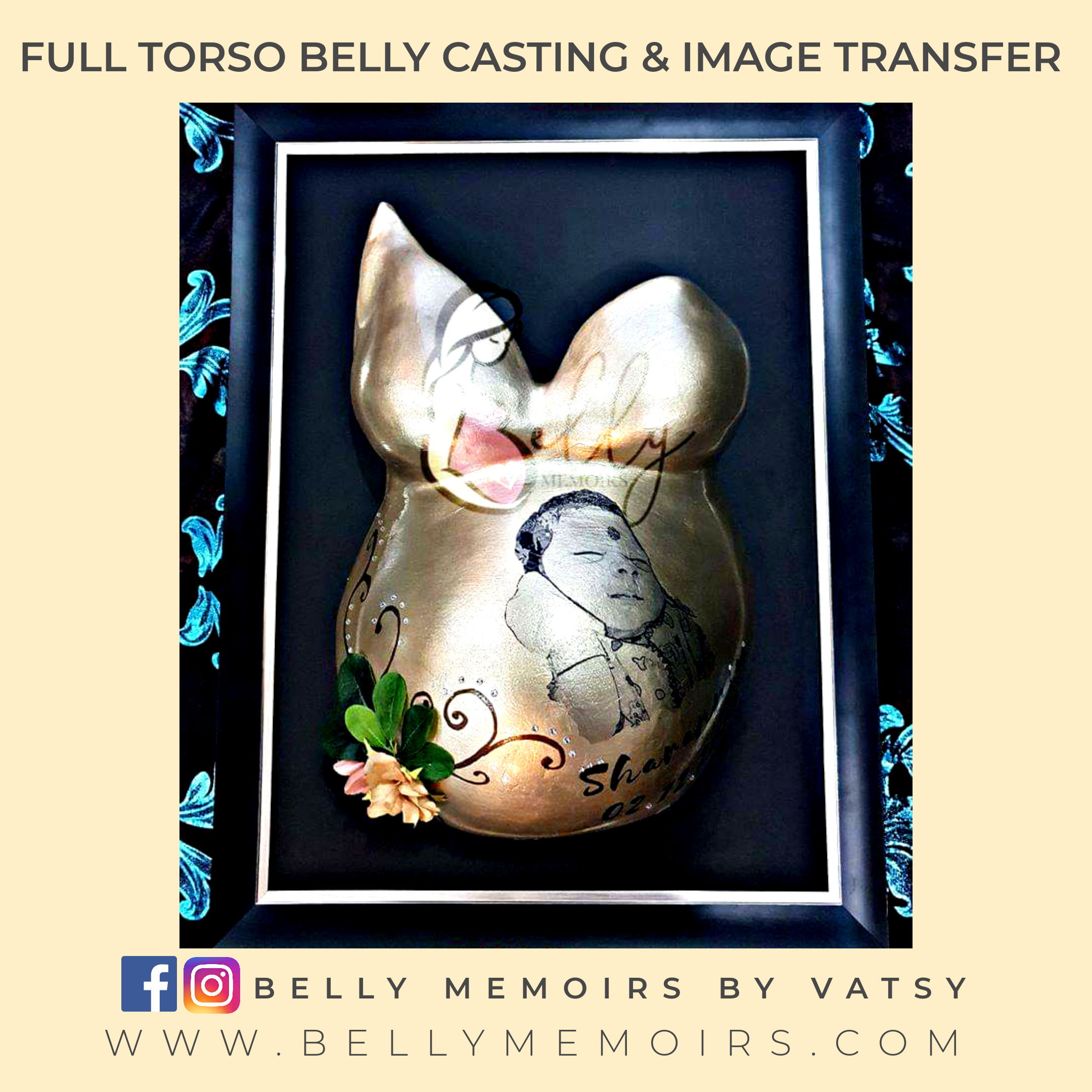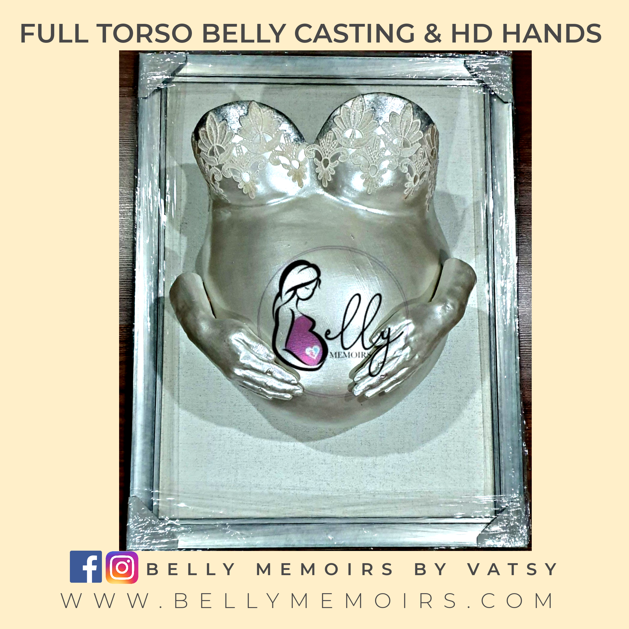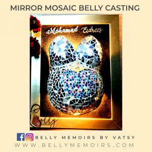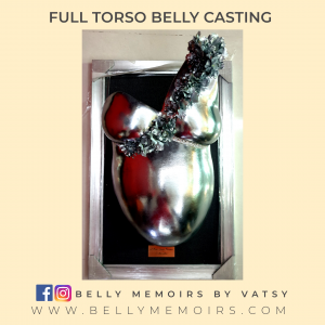 This captures the full torso that includes breast upto belly as part of the casting. It can be left plain with the color of your choise complete with a frame or customised with adding on the parents hands, newborn’s feet cast, painting, mirror mosaic or just about anything you want.Can be done up to 37 weeks of pregnancy.